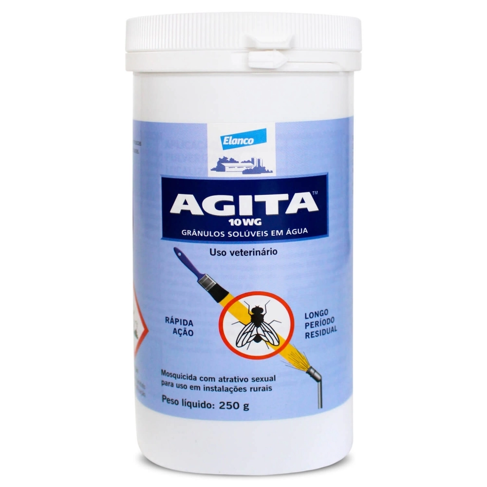Misturar bem 250g de Agita 10 WG em 2 litros de água. Utilizar um pulverizador manual e borrifar de forma localizada, somente nos locais preferidos pelas moscas domésticas. Desta forma, obtém-se diversos pontos de atração e controle de moscas dentro da instalação, sem precisar formar a tradicional nuvem de inseticida, que irrita os animais. Para isso, regular o bico do pulverizador para ponto de chuva fina. Efeito residual: até 4 a 6 semanas.