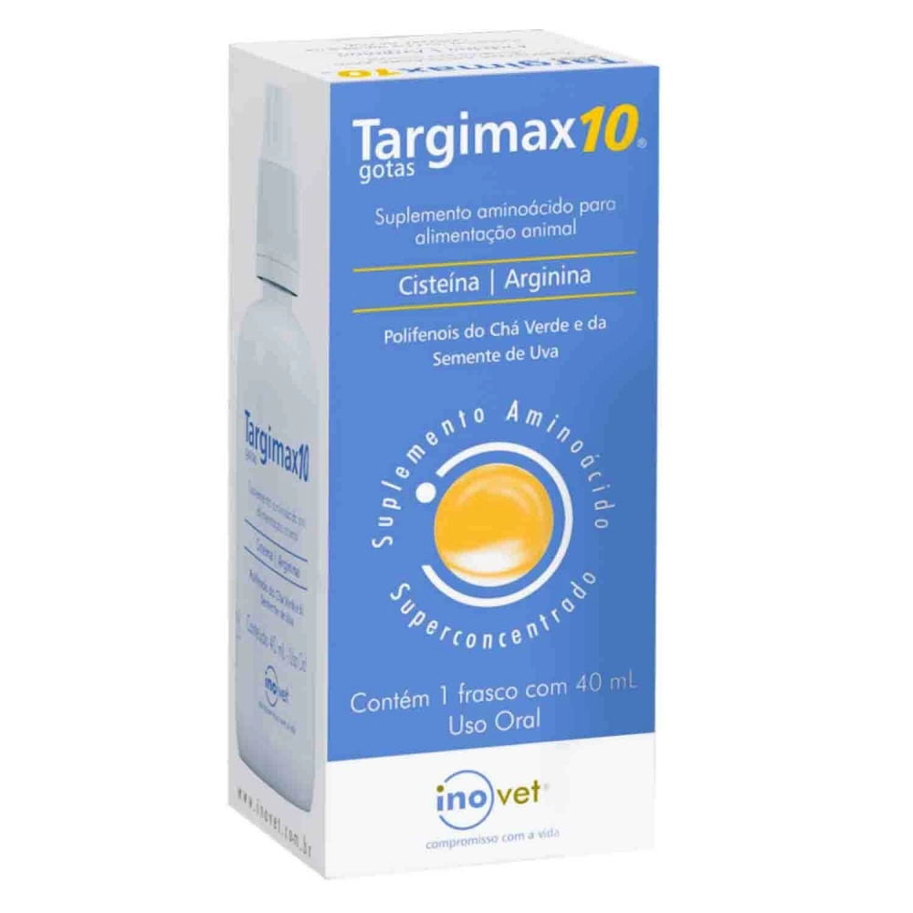 Targimax 10 é um suplemento nutricional de resposta rápida e direcionamento indicado na suplementação de nutrientes para caninos, felinos, aves, mustelídeos, répteis, roedores e outros. Concentra nutrientes antioxidantes dispersíveis em líquidos extracelulares como os Polifenóis do Chá Verde e Extrato de Semente de Uva, contém também nutrientes de reposição endógena como a Cisteína, precursora da Glutationa endógena (antioxidante intracelular) e a Arginina, precursora do óxido nítrico endógeno.