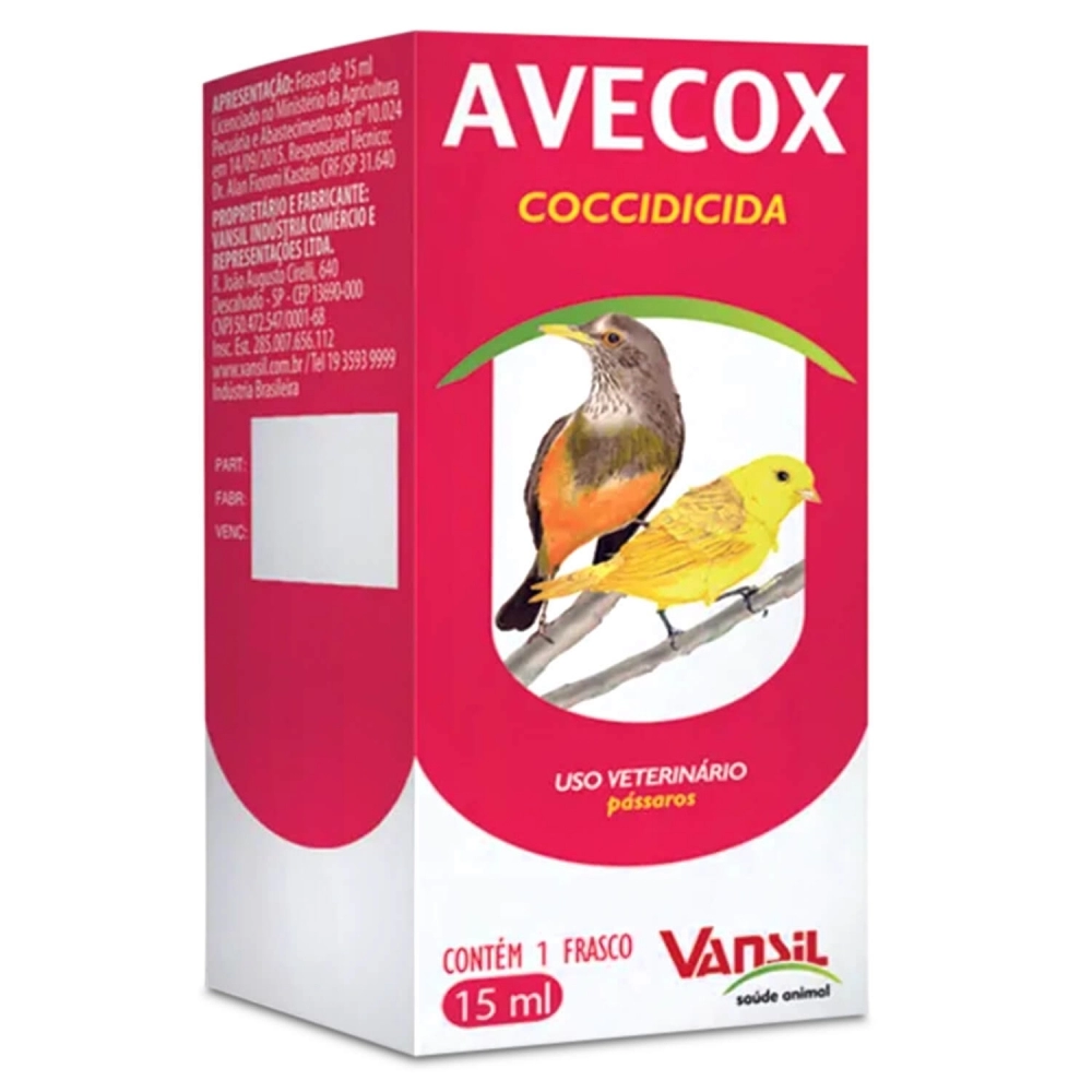 Coccidicida para pássaros, Avecox é indicado para tratar a coccidiose em pássaros causadas por Eimeria acervulina, Eimeria maxima, Eimeria tenella, Eimeria necatrix, Eimeria brunetti, Isospora andesensis, Isospora gryphoni, Isospora sporophilae, Isospora flausinoi, Isospora teixeirafilhoi e Isospora adiei.
