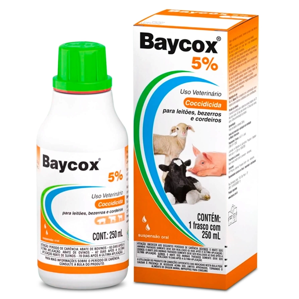 Baycox 5% é especialmente indicado para a metafilaxia e tratamento da coccidiose em leitões, causada por Isospora suis, o principal patógeno associado com a diarreia em leitões entre 5 e 30 dias de idade; para metafilaxia e tratamento da coccidiose em bezerros e cordeiros, causada por Eimeria spp., e principalmente por Eimeria bovis, Eimeria alabamensis e Eimeria zuernii, importantes patógenos associados com a diarreia em bezerros, especialmente a diarreia negra, e Eimeria crandallis e Eimeria ovinoidalis associadas à diarreia em cordeiros. Baycox 5% é compatível com a administração de antibióticos.