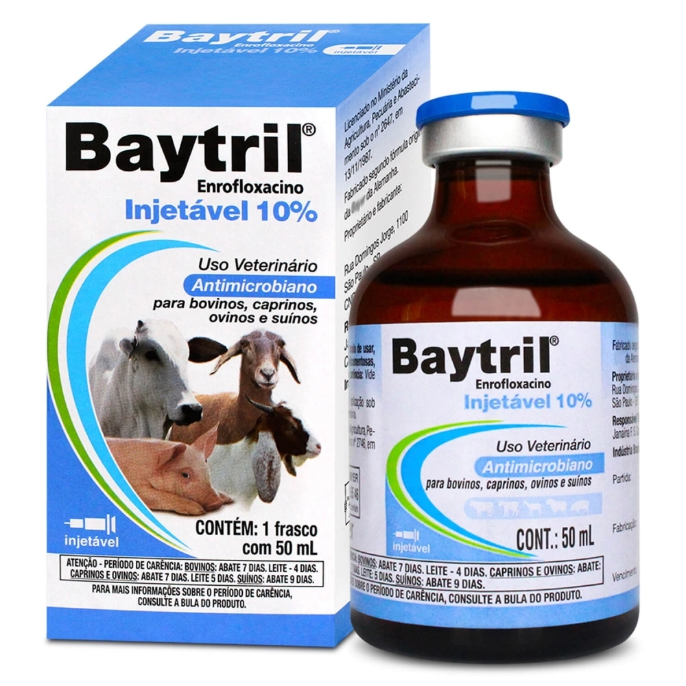 Baytril Injetável 10% é um antibiótico à base de enrofloxacino com a vantagem especial de possuir uma elevada eficácia contra bactérias e micoplasmas resistentes a outras substâncias antimicrobianas.
