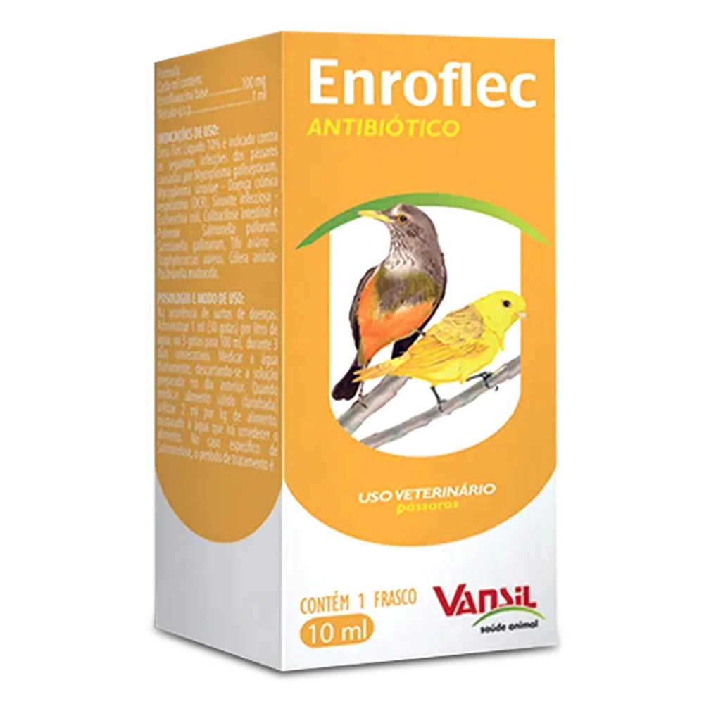 Enro Flec é indicado contra as seguintes infecções dos pássaros causadas por Mycoplasma gallisepticum, Mycoplasma sinoviae - Doença crônica respiratória (DCR), Sinovite Infecciosa - Escherichia coli, Colibacilose intestinal e Pulorose - Salmonella pullorum, Salmonella gallinarum, Tifo Aviário - Staphylococcus aureus, Cólera Aviária - Pasteurella multocida.