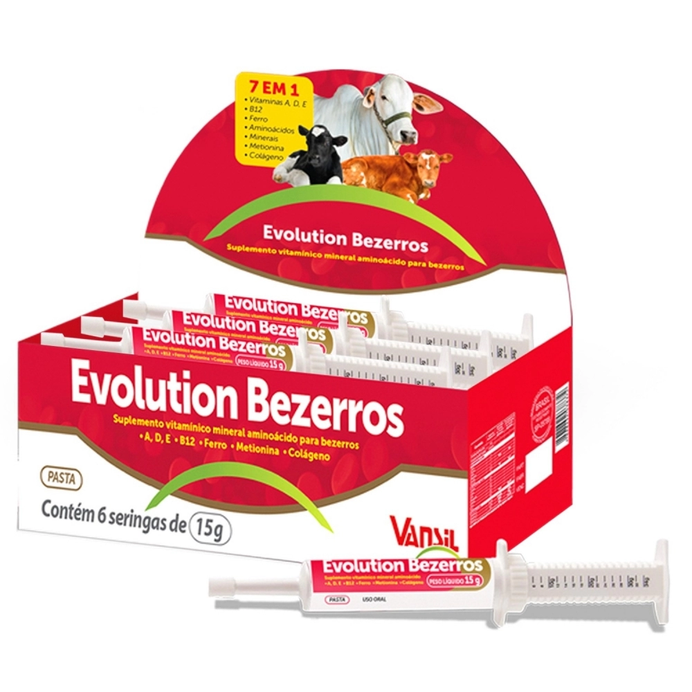 O Evolution Bezerros é um suplemento vitamínico, mineral e aminoácido para bezerros, sendo um produto 7 em 1, que traz em sua fórmula Vitaminas A, D, E, B12, Ferro, Aminoácidos, Minerais, Metionina e Colágeno. Apresentado em pasta, o lançamento é a suplementação adequada para o animal nos casos de magreza, fraqueza, tristeza parasitária, baixa imunidade, estresse na desmama, ganho de peso, desidratação e transporte.