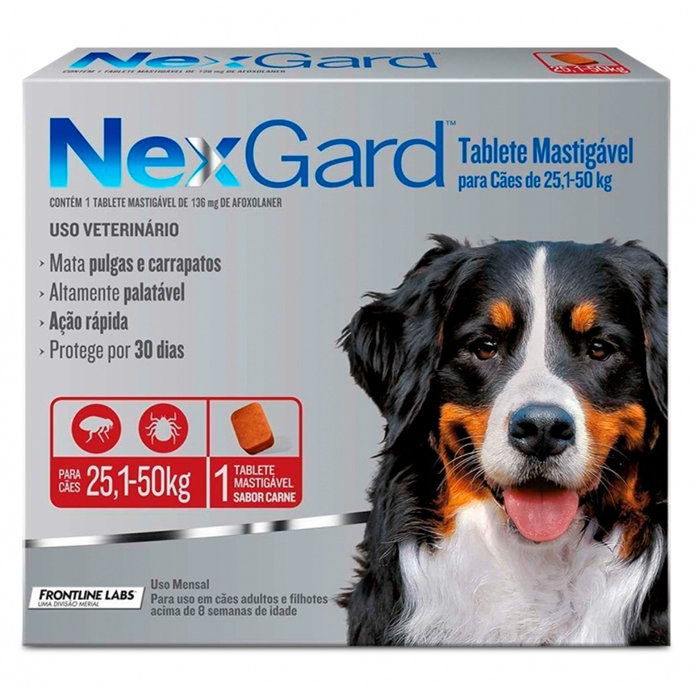 O Nexgard é Referência no tratamento contra pulgas e carrapatos, comprovadamente seguro para cães de qualquer raça e conta com uma linha completa para atender diferentes portes e pesos. Pode ser administrado em cães adultos e filhotes a partir de oito semanas de vida e pesando acima de 2kg. Nexgard tem um rápido início de ação e atinge 100% de eficácia em 8 horas para pulgas, e funciona por 30 dias. Para manter seu cão livre de pulgas e carrapatos, faça o tratamento mensal.
