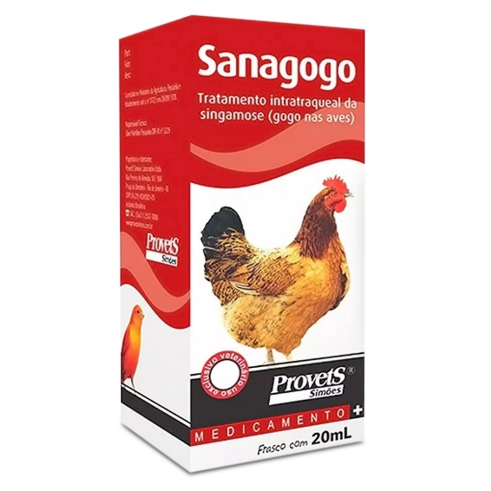 Imobilizar a ave delicadamente. Com os dedos, polegar e indicador, abrir o bico e elevando a garganta da ave, até aparecer o orifício da laringe, pingar 2 a 5 gotas de Sanagogo neste orifício, tomando-se cuidado para não asfixiar a ave. Um só tratamento é suficiente.