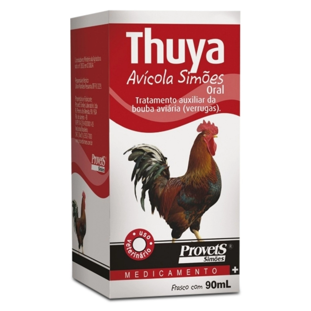 Thuya Avícola Simões é um produto indicado no tratamento de bouba (pipoca), verrugas e epitelioma contagioso das aves em geral (galinha, peru, pato, pássaros de gaiola e viveiro) em todas as fases da criação, evitando as complicações que a doença produz, podendo ser aplicado diretamente ou diluído no bebedouro.