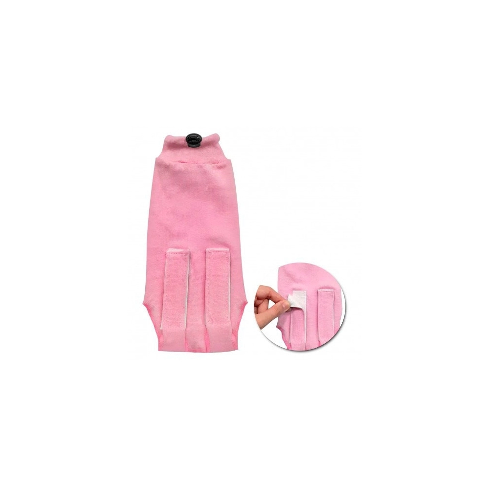 Possui fechamento por velcro e ajuste por elástico no pescoço
