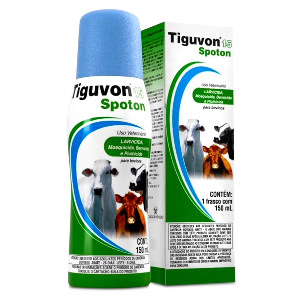 Tiguvon 15 Spot-on é um bernicida, mosquicida, piolhicida e larvicida sistêmico pronto para uso, especialmente indicado para grandes rebanhos. É rapidamente absorvido pela pele, distribuindo-se por meio da corrente sanguínea por todo o corpo do animal, eliminando bernes, moscas, piolhos e bicheiras.